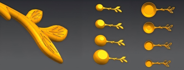 First, involved assessing the product’s shape and potential usage based on prior experience.Using zinc alloy as the primary material,we calculated material density and surface characteristics,incorporated ergonomics and designed the overall dimensions for the four measuring spoons or ice spoons.Subsequently,we refined each curve,R-radius angles and other small-scale details based on these dimensions.