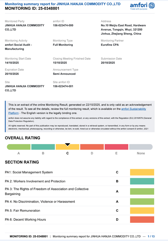 Jinhua Hanjia commodity Co., Ltd. has released the results of its BSCI audit.On October 14th, the company successfully passed the professional evaluation and obtained a Class C certification,which meets the minimum requirement specified by the customer.The validity period of this certification is one year.The BSCI audit was conducted by the EUROFINS agency selected by the customer.This customer has been purchasing wine openers,wine accessories and stainless steel products such as cocktail shaker from our company for a long time.The customer’s country requires suppliers to possess this certification.