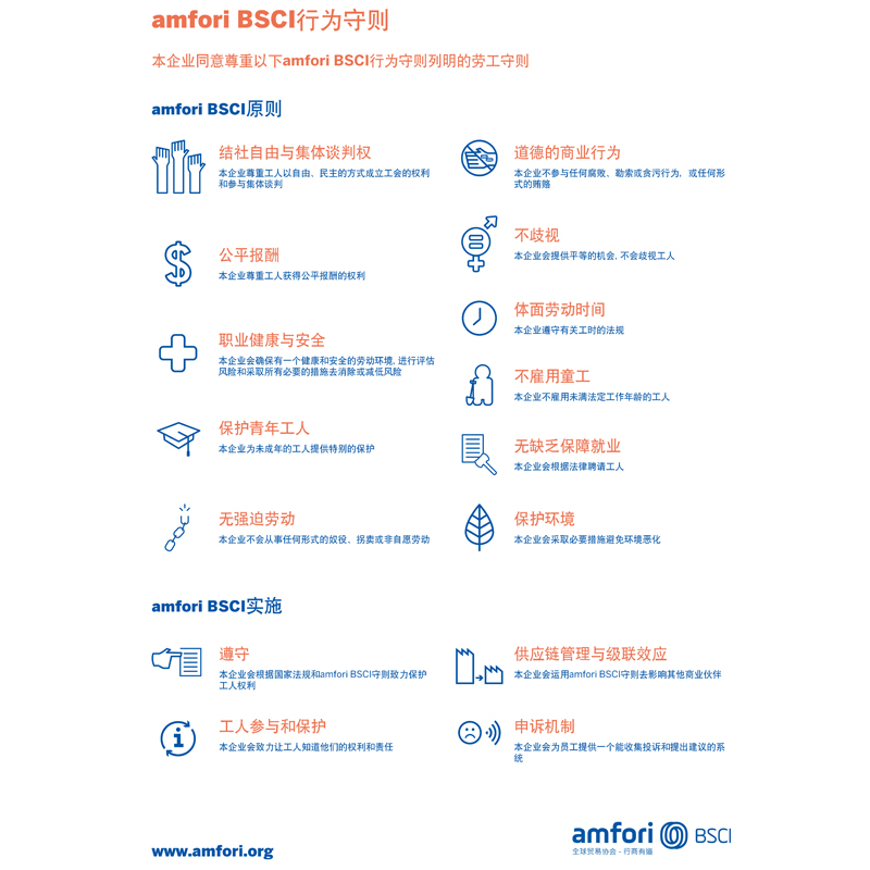 In accordance with the requirements of BSCI regulations,our company will strictly adhere to the labor guidelines outlined in the Amfori BSCI Code of Conduct to ensure the effective implementation of BSCI principles.During the production process,we respect the rights of workers to establish unions in a free and democratic manner and to participate in collective bargaining.We also commit to non-discrimination,avoid the employment of child labor and ensure that workers receive fair labor practices and compensation. Additionally,we guarantee that workers have decent working hours and other fundamental rights.