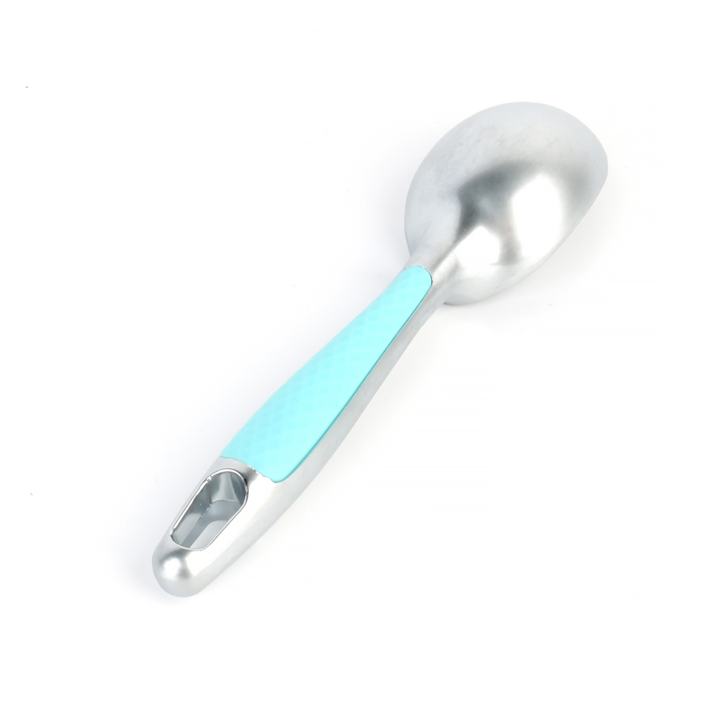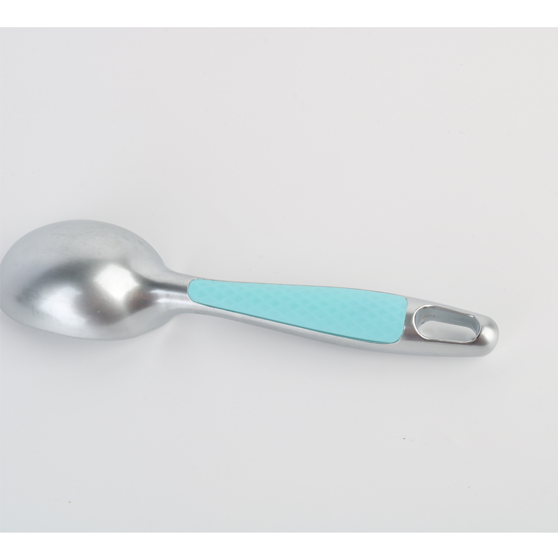 The professional zinc alloy ice cream scoop with comfortable grip dishwasher safe unique cushioned,non-slip plastic handle is located on the reverse side of the product,specifically designed for optimal grip when using the four-finger reverse grip.As shown in the product illustrations,the handle incorporates a textured surface pattern that ensures secure handling while reducing hand fatigue.This thoughtful design not only improves user experience but also demonstrates our commitment to combining practicality with elegant craftsmanship in every detail.